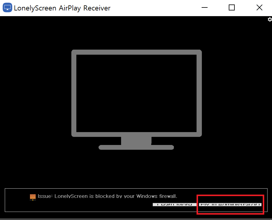 그리고 마지막으로 설정해야 할 것이 있다. 프로그램을 설치하고 나면 위와 같이 방화벽에 의하여 론리스크린이 블락되었다고 나온다. 설치 과정 중에 방화벽에 액세스를 허용시켰는데도 왜 이런 메시지가 뜨는지 잘 이해가 가지 않지만, 우측 버튼을 클릭하여 문제를 해결하면 된다. 그리고 모니터 그림 밑에 미러링 신호를 받는 컴퓨터의 이름을 설정할 수 있다. 참고로 위의 화면에서는 버튼에 적힌 메시지가 잘 보이지 않는데 좌측이 learn more이고 우측이 fix it(administrator)이라는 버튼이다.