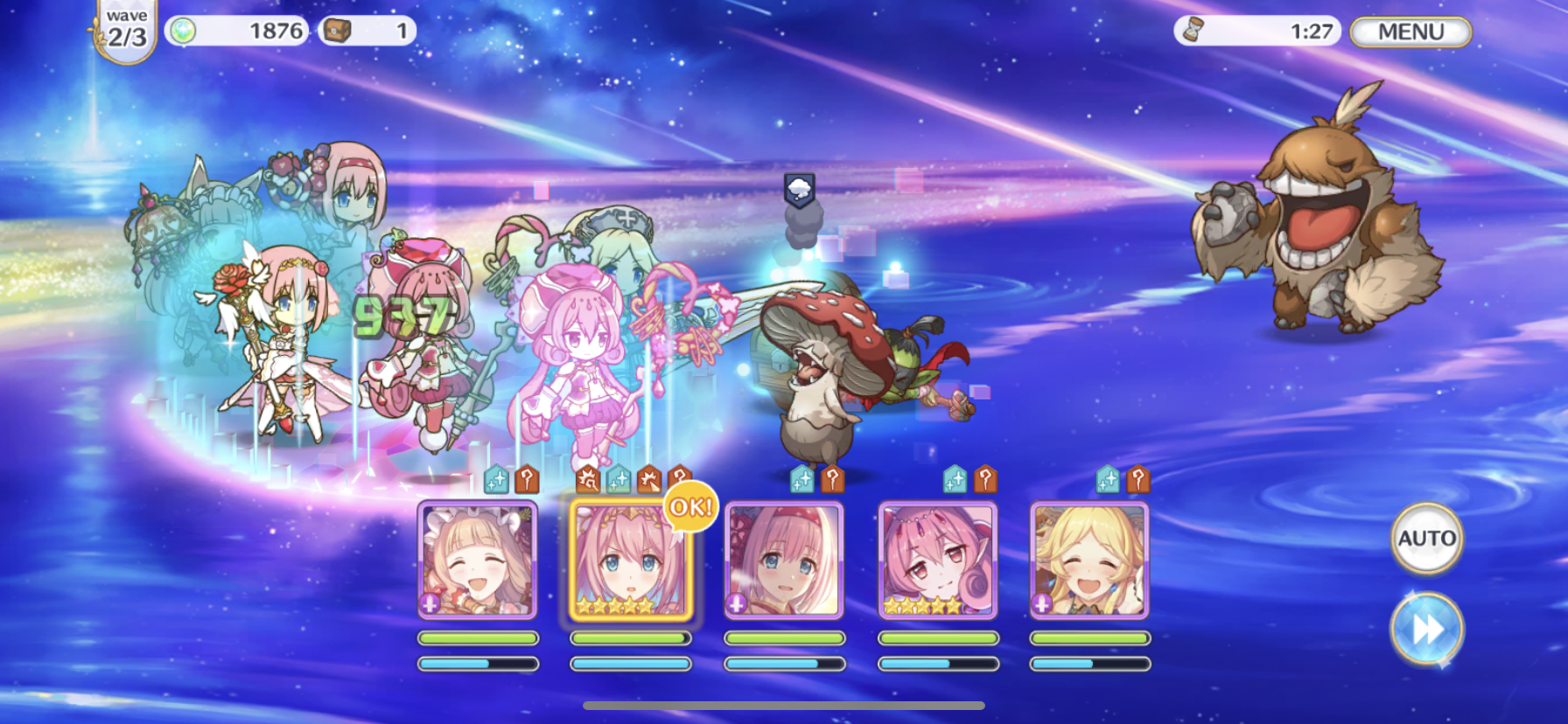 그리고 오토버튼으로 진행을 자동, 수동으로 설정이 가능하며, 바로 밑에 배속버튼을 통해 게임의 진행속도를 조절할 수 있다. 오토로 설정하지 않으면 플레이어가 캐릭터의 초상화를 클릭하여 유니언버스트 스킬을 발동시켜야 한다.
