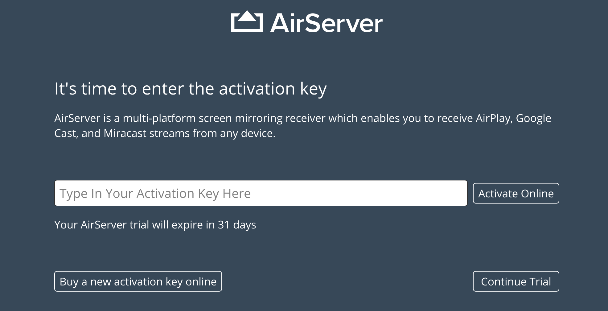 구글에서 airserver로 검색하면 나오는 에어서버 공식 홈페이지에서 프로그램을 다운받아 설치를 하면 됩니다. 프로그램이 윈도우, 맥OS, XBox(게임기)용으로 나뉘어져 있으니 자신의 컴퓨터 운영체제와 같은것을 다운받아야 합니다. 저는 윈도우10을 사용하고 있기때문에 윈도우10을 다운받아 설치하였습니다. 설치를 하고나서 프로그램을 실행하면 아래와 같이 라이센스를 활성화 하라는 창이 뜹니다.