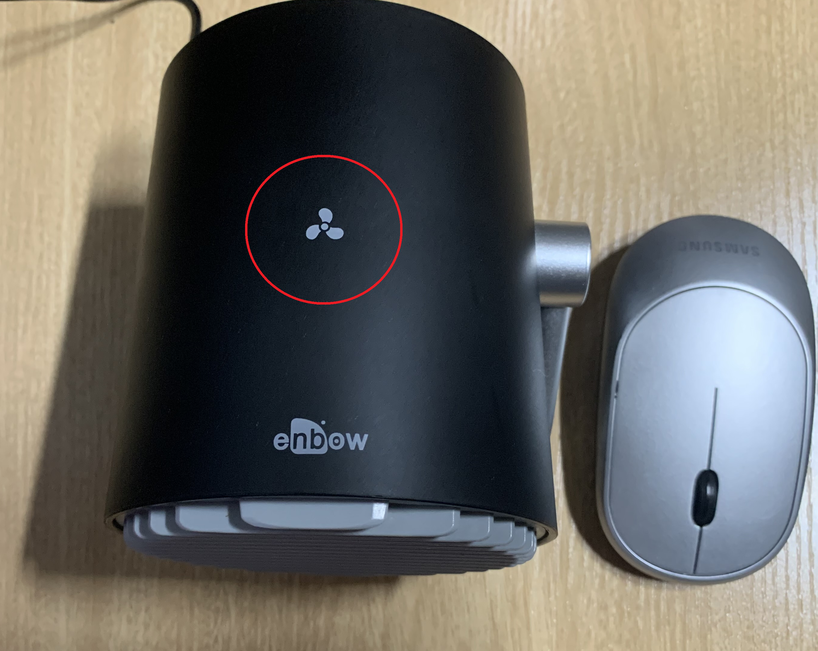 위에 붉은색 동그라미로 표시한 부분이 전원 스위치 입니다. 터치방식이기 때문에 가볍게 터치하면 작동됩니다. 처음 터치하면 약풍이고 또 한번 터치하면 강풍이 됩니다. 그리고 또 한번더 터치하면 선풍기가 꺼지는 구조였습니다. 이렇게 작동 사이클이 반복되는 제품이었습니다. 그리고 참고로 크기비교를 위하여 옆에 마우스를 두었습니다. 제품의 길이는 마우스보다 약간 큰 정도이고, 폭은 마우스와 비슷한 크기를 가졌습니다.