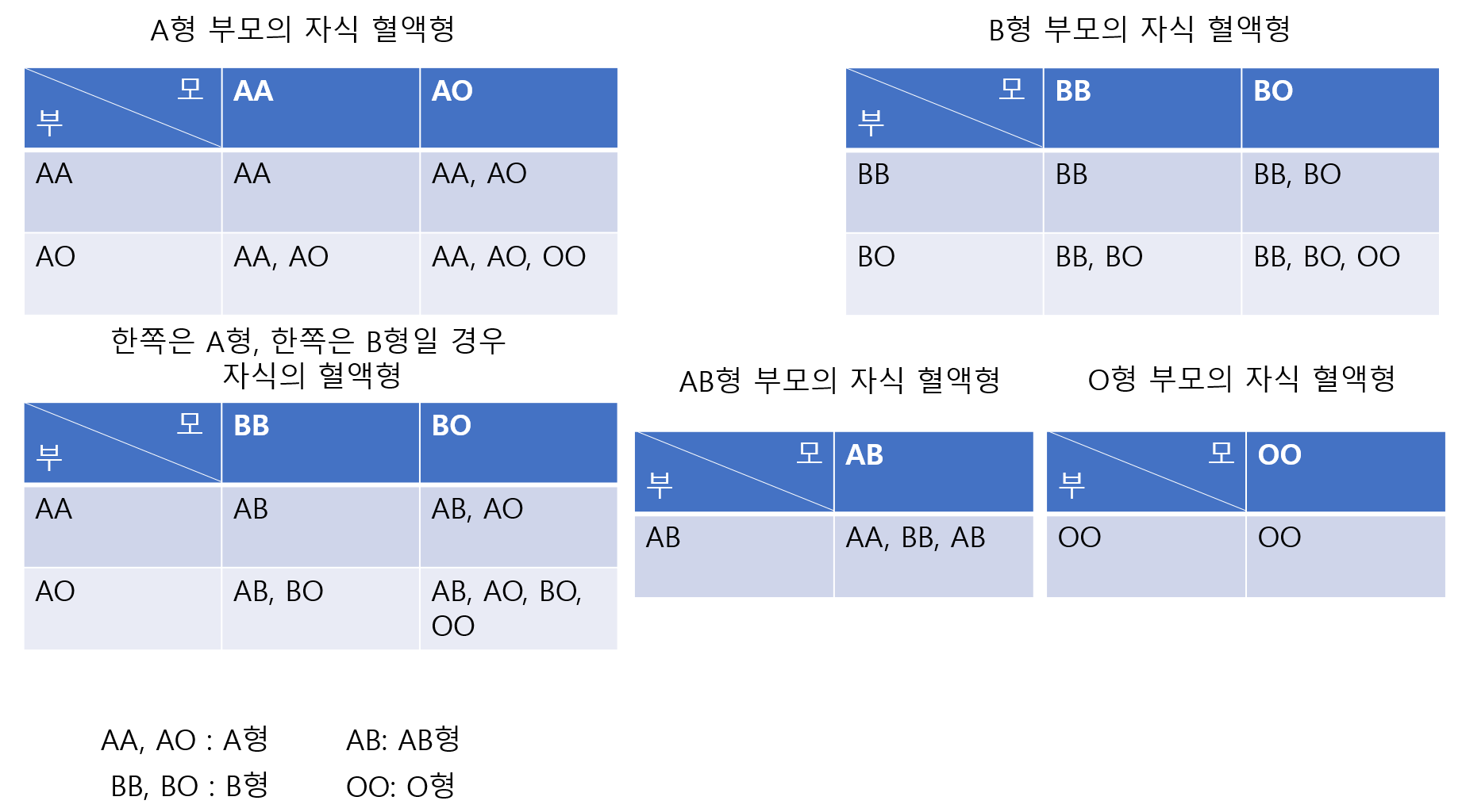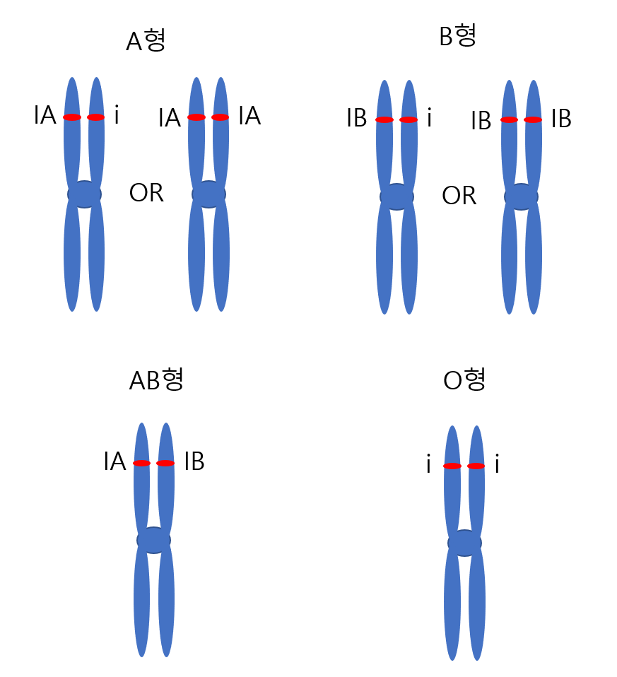 * 편의성을 위해 혈액형 유전자를 IA를 A로, IB를 B로, i를 O로 표기하겠습니다.