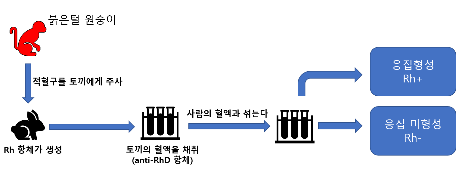 붉은털 원숭이의 적혈구를 토끼에게 주입하고, 주입한 토끼의 혈액을 다시 붉은 털 원숭이의 혈액과 반응시켰더니 응집반응이 일어났고, 이 현상을 1940년 카를 란트슈타이너에 의해 발견되었습니다. 이때 사용한 붉은 털 원숭이의 속명인 rhesus에서 rh를 따서 Rh 혈액형이라고 명명하였습니다.